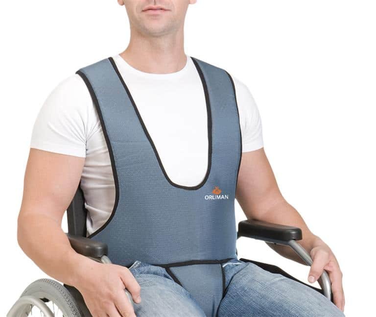 Fabricado en material semirrígido transpirable tricapa de (poliamida, espuma y poliéster), posee cinchas de regulación y sujeción con hebillas de cierre identificadas mediante código de colores para facilitar su colocación. Consta de un cinturón abdominal unido a peto con hombreras y cincha perineal, en cuyos extremos posee cincha de ratier con pasador y sistema de cierre que permite regular la sujeción deseada.