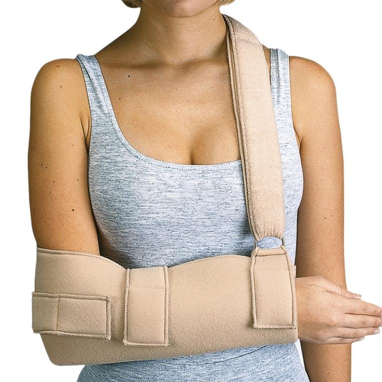 Cabestrillo fabricado en velour con rizo de algodón interno en forma de bolsa para el antebrazo y cierre velcro. Banda de fijación que permite regular la altura del brazo, banda independiente inmovilizadora de hombro ajustable en la cintura.