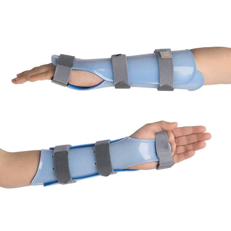 Férula fabricada en polietileno de baja densidad de 2 mm, forrada con espuma de polietileno reticulado azul de 3 mm, que incorpora 3 cinchas de velour gris con puntas de microgancho para su cierre y ajuste sobre el paciente.