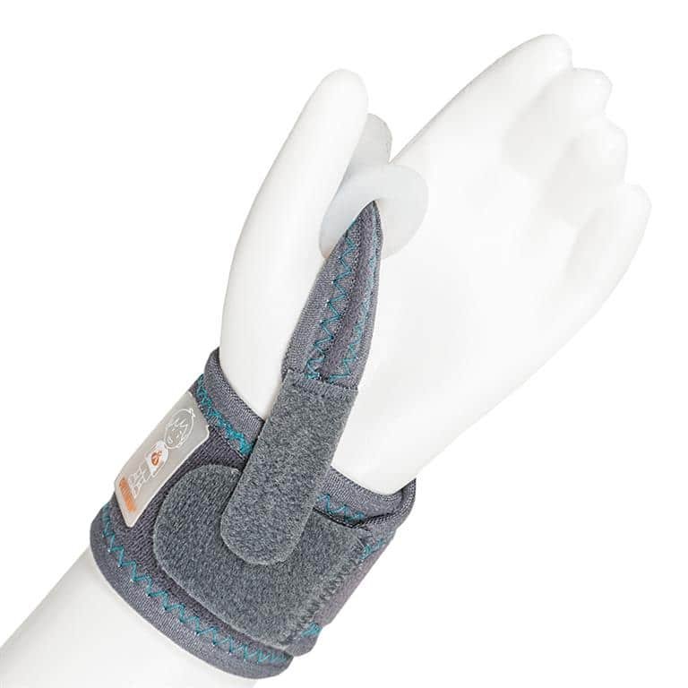 Muñequera confeccionada en material transpirable y elástico, que permite regular la compresión y la tracción ejercida sobre el pulgar en función de las necesidades de cada paciente. Provista de una cincha elástica que permite la estabilización y abducción de la articulación metacarpofalángica del pulgar.